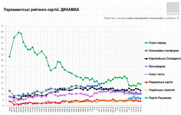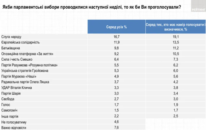 Партию "Сила и честь" поддерживают 7,3%, партию Разумкова "Разумная политика" – 6,2%, партию "Украинская стратегия Гройсмана" – 6,0%, партию Мураева "Наши" – 5,6%, Радикальную партию – 4,2%, "УДАР Виталия Кличко" – 3,8%, партию Шария – 3,4%, ВО "Свобода" – 3,0%.