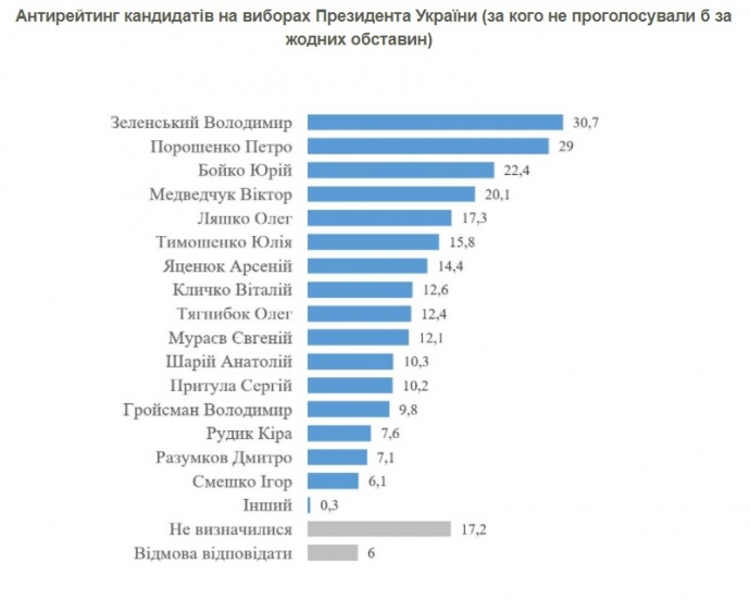 У Олега Ляшко "антирейтинг" достигает 17,3%.