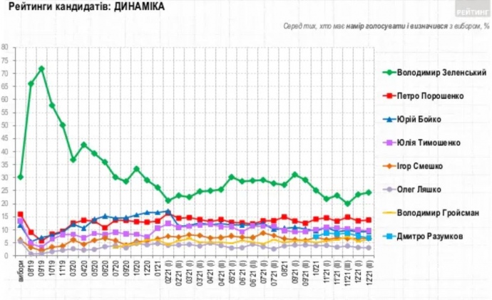 В президентском рейтинге Зеленский опережает оппонентов более чем на 10%