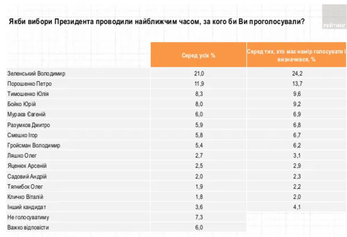 13,7% поддержали бы Порошенко, 9,6% – Юлию Тимошенко, 9,2% – Юрия Бойко, 6,9% – Евгена Мураева, 6,8% – Дмитрия Разумкова, 6,7% – Игоря Смешко, 6,2% - Владимира Гройсмана, 3,1% - Олегя Ляшко".