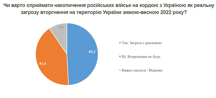 49,2% украинцев считают реальной угрозу вторжения России на территорию Украины, 41,4% считают, что нападения не будет.