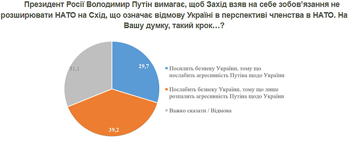 Детали: 39,2% респондентов считают, что выполнение требования президента России Владимира Путина не принимать Украину в НАТО ослабит безопасность Украины, поскольку только разожжет агрессивность Путина по отношению к Украине.