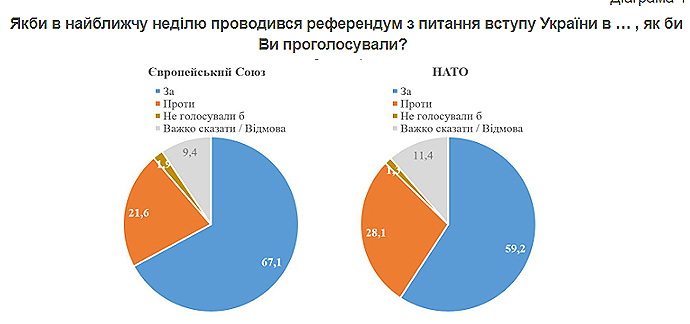 Социологи отмечают, что среди жителей Запада и Центра подавляющее большинство поддерживают и вступление в ЕС, и вступление в НАТО.