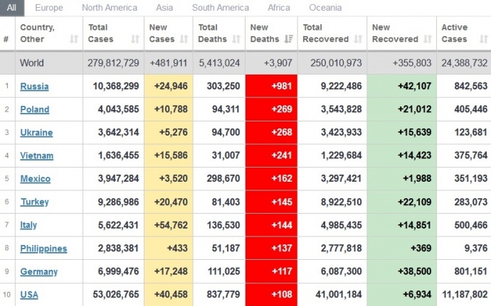 24 декабря в мире диагностировали почти 482 тысячи новых случаев заболевания коронавирусом. Больше всего смертей в сутки от коронавируса в России (981), Польше (269), Украине (268).