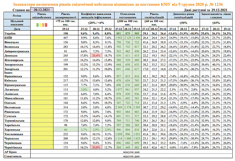 По состоянию на 30 декабря Волынская и Запорожская области вышли из красного уровня эпидопасности распространения коронавируса, а Донецкая и Черниговская области покинули оранжевую зону.