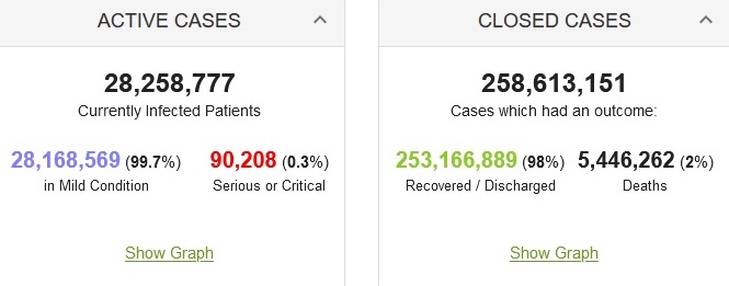 За все время пандемии излечились от болезни 253 166 889 человек. В настоящее время насчитывается более 28 млн. активных случаев заболевания.