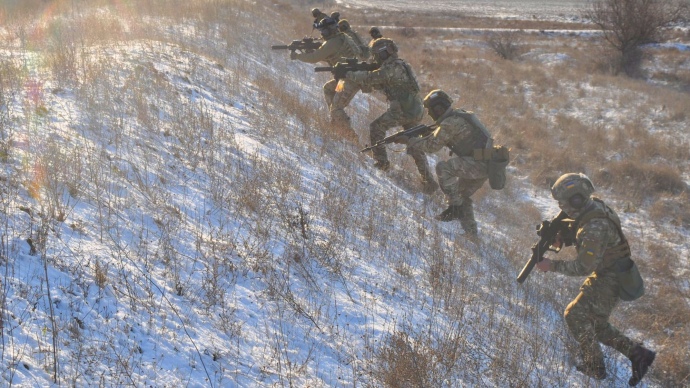 Украинские военные-разведчики проводят тренировки по стрельбе на близком расстоянии вблизи административного предела с временно оккупированным Крымом.