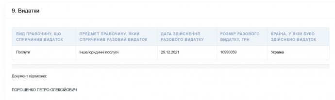 В декларации Порошенко указывает, что 29 декабря 2021 года потратил на юридические услуги 10 990 059 гривен.