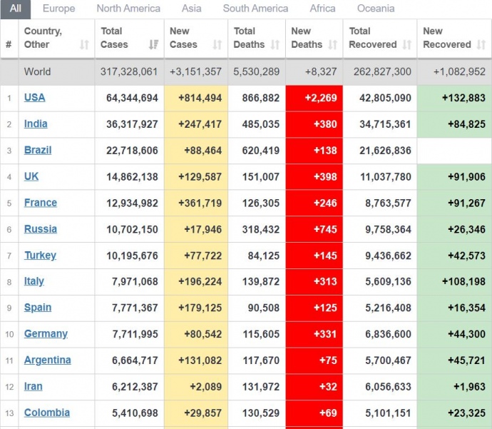 С начала пандемии подтверждено 317 328 061 случаев заболевания и 5 530 289 смертей от Covid-19.
