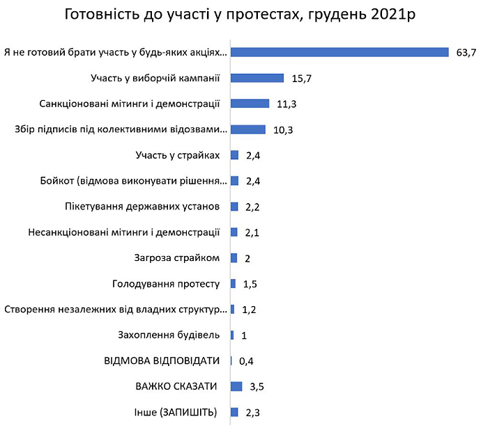 В декабре 2021 года в акциях протеста готовы участвовать 32,4% взрослых жителей Украины. Уровень готовности к участию в акциях социального протеста снизился на 5,6% по сравнению с 2020 годом".