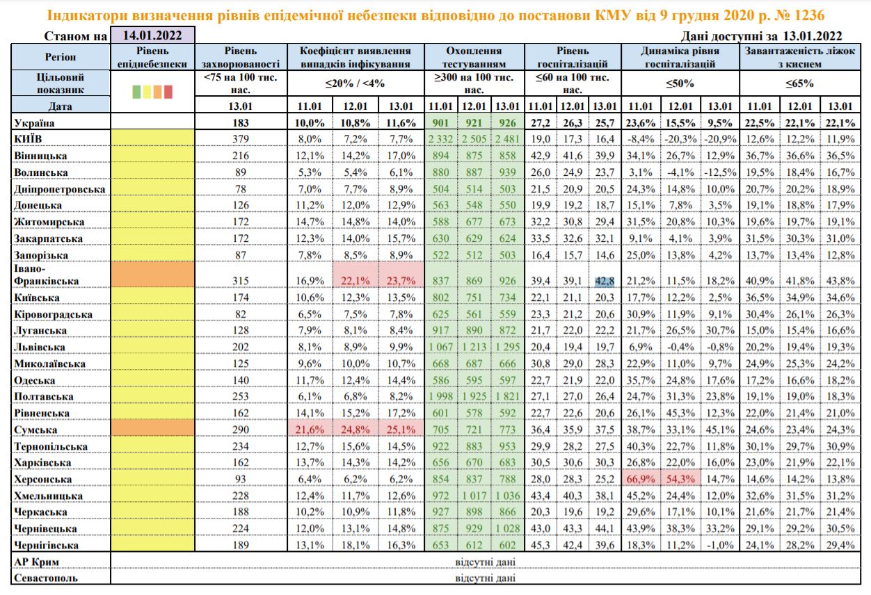 Уровень госпитализаций по стране 13 января составил 25,7 при пороговом значении 60 на 100 тысяч населения. Самый высокий он в Черновицкой (44,1) и Ивано-Франковской (42,8) областях.