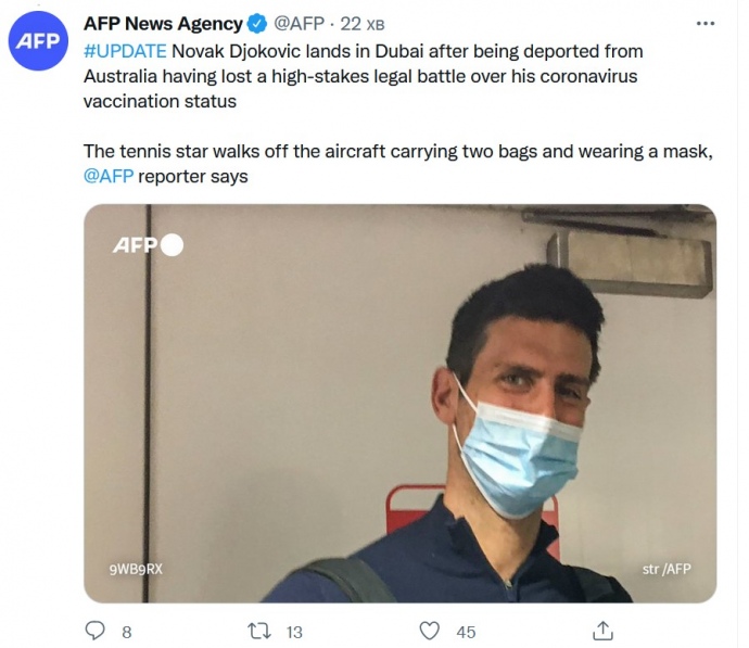 В субботу утром Новака Джоковича по решению суда задержала иммиграционная служба Австралии. Перед этим Джоковичу дважды аннулировали визу, поскольку он не вакцинирован против коронавируса.