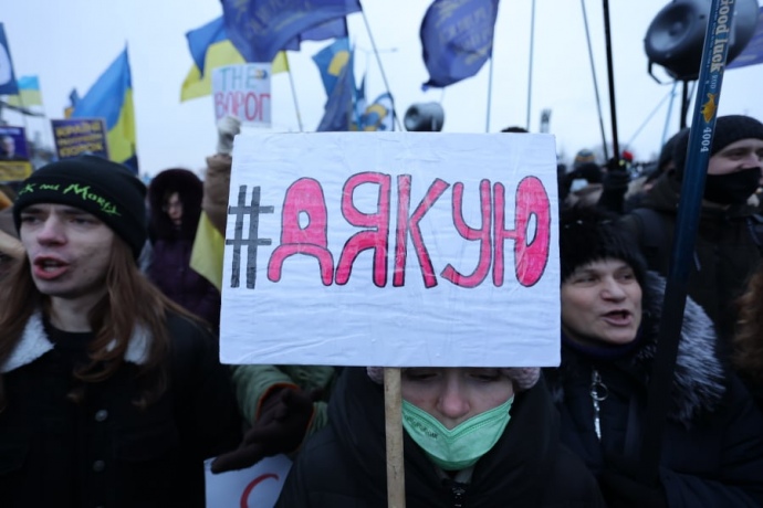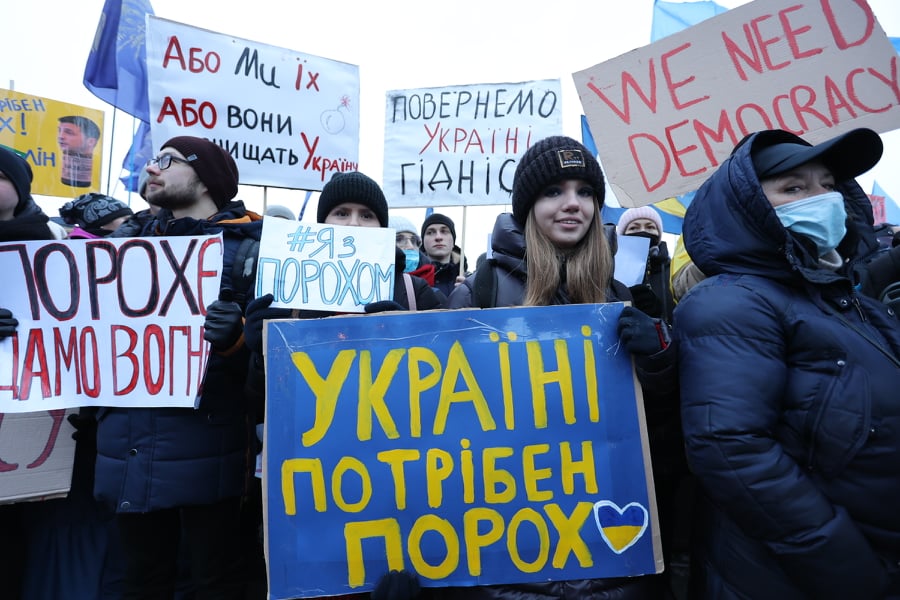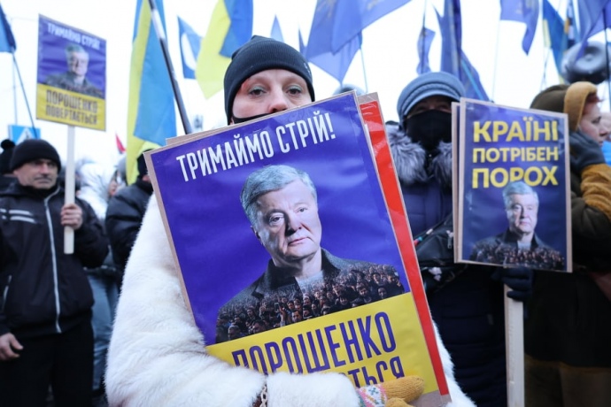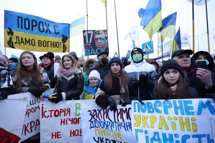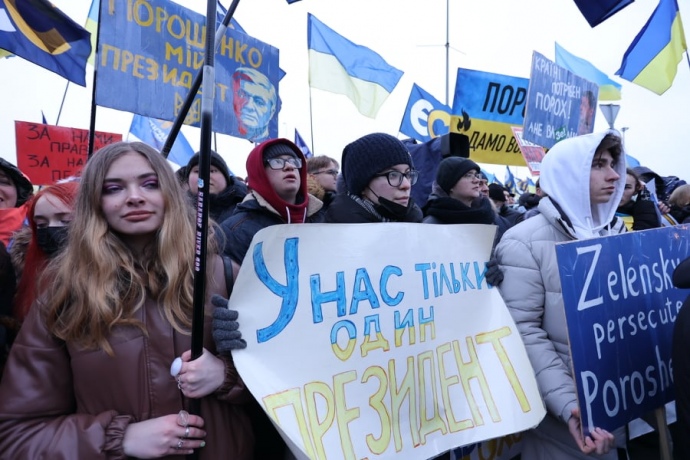 Они держат в руках плакаты с лозунгами: "Нет диктатуре", "Украине не подходит Ze-любовь", "Украине нужен Порох", "I'll be back, Poroshenko", "Порох есть – дадим огня" и тому подобное.