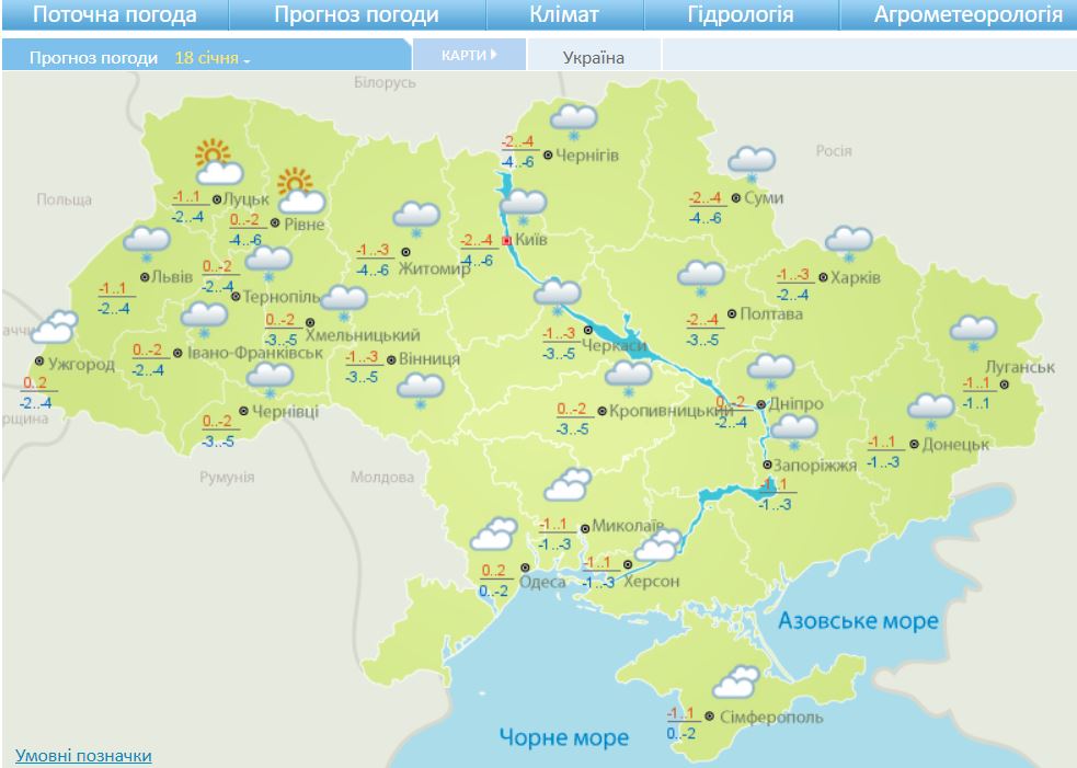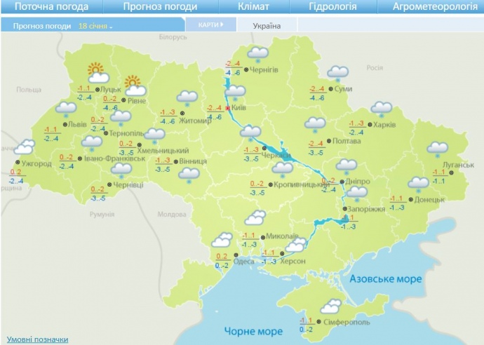 На территории Украины 18 января прогнозируют облачную погоду с небольшим снегом, а на дорогах местами гололедица.