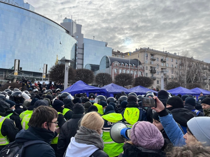 Потом правоохранители пытались разобрать палатки сторонников Порошенко, но через несколько минут давки они оставили палатки в покое.