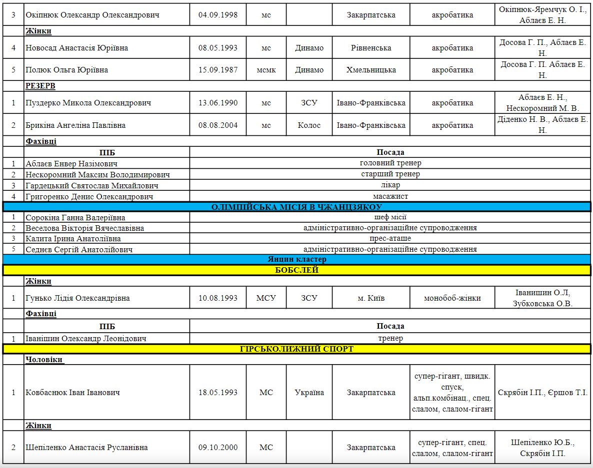 Состав Олимпийской команды-2022 насчитывает четырех Олимпийских чемпионов: биатлонистки Елена Белосюк (Подгрушная), Юлия Джима, Валентина Семеренко и фристайлист Александр Абраменко, а также три призера Юношеских Олимпийских игр – фигуристы Александра Назарова-Максим Никитин.