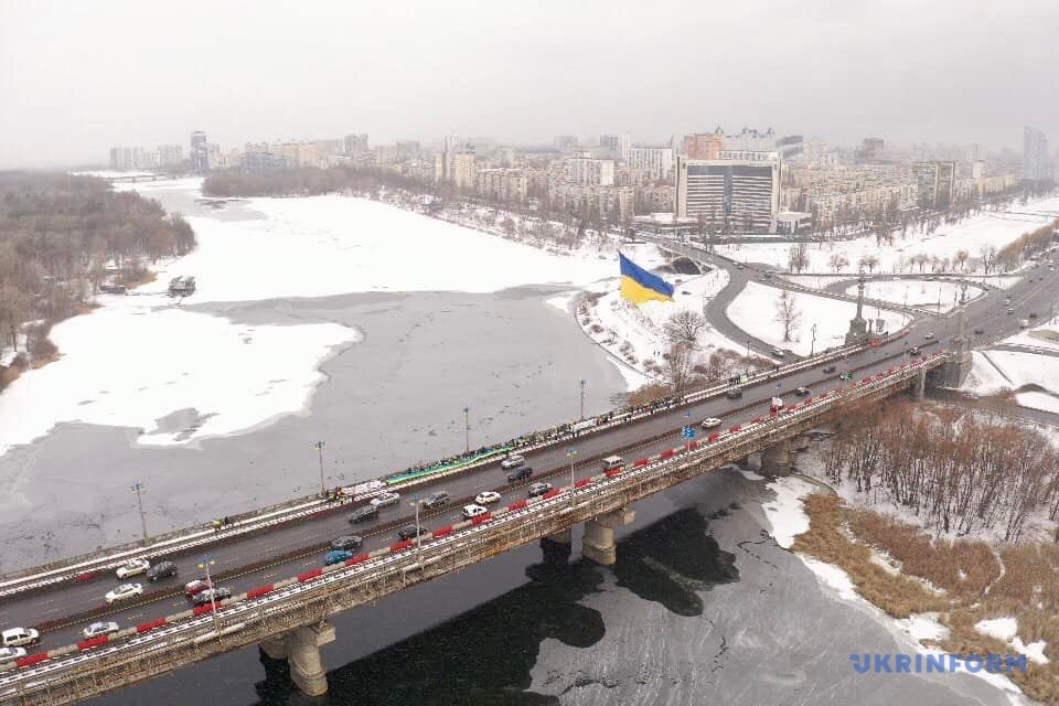 На мосту Патона в Киеве к годовщине провозглашения Акта объединения активисты традиционно образовали "живую цепь Соборности" как символ единства людей на востоке и западе Украины.