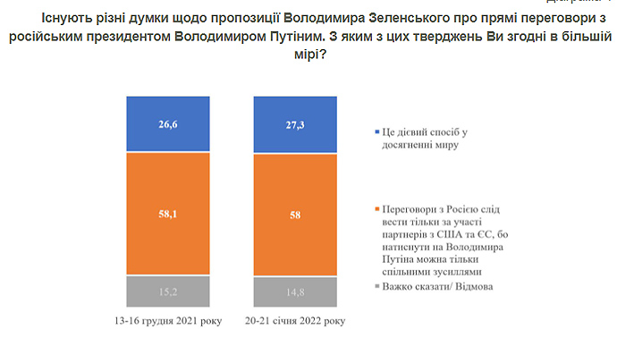 Дословно КМИС: "Большинство респондентов – 58% – считают, что переговоры с Владимиром Путиным следует вести только с участием западных партнеров. Считают прямые переговоры Владимира Зеленского и Владимира Путина действенным способом достижения мира – 27,3% респондентов".