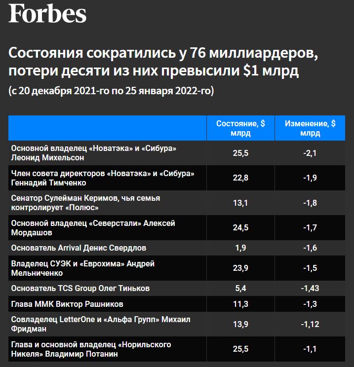 С 20 декабря 2021 года по 25 января 2022-го совокупное состояние 104 российских миллиардеров сократилось на 27,9 миллиарда долларов из-за российской агрессии против Украины и информации о возможном вторжении РФ на территорию соседнего государства.
