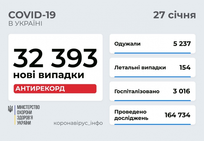За сутки 26 января в Украине зафиксировали 32 393 случаев заболевания коронавирусной болезнью Covid-19 – это резкий скачок и абсолютный максимум за 2 года пандемии.
