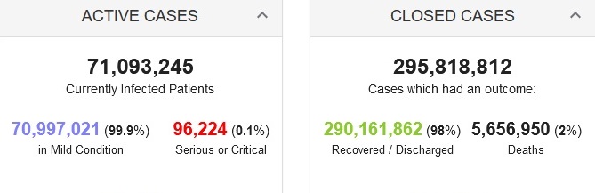За все время пандемии излечились от болезни 290 161 862 человека. В настоящее время насчитывается около 71 млн активных случаев заболевания.