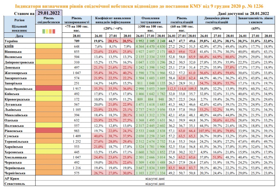 По состоянию на 29 января Минздрав относит две области Украины к красному уровню эпидемической опасности и 16 – к оранжевому.