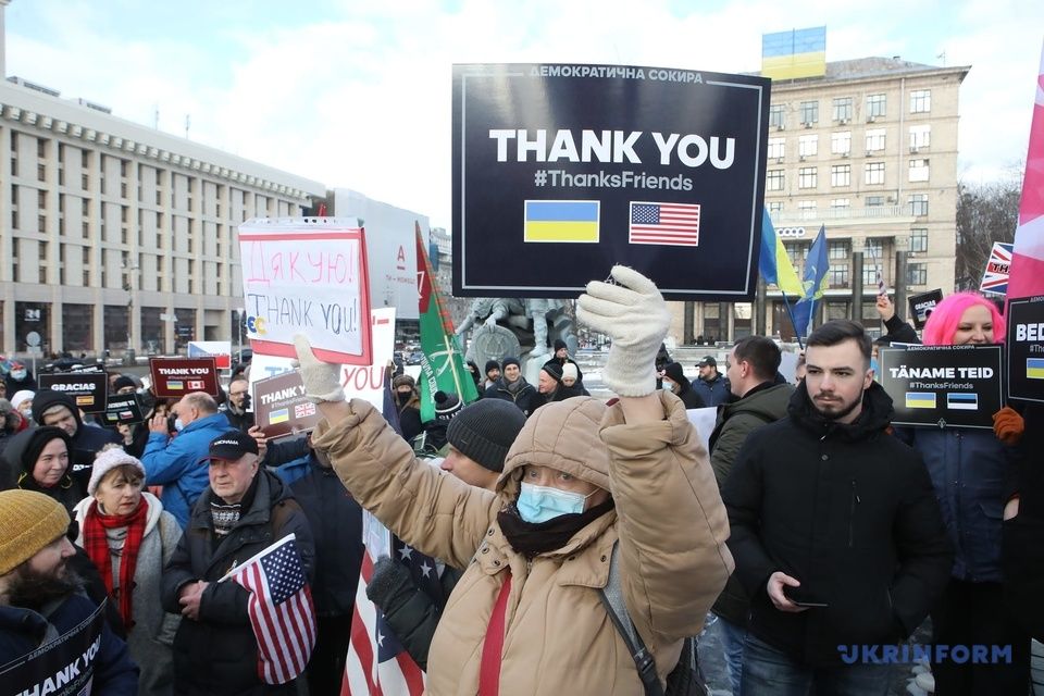 По данным Укринформа, на момент начала акции на Майдане Незалежности находилось не менее сотни человек. Большая часть из них имела при себе флаги разных иностранных государств, а также плакаты с надписями "спасибо" на разных языках.