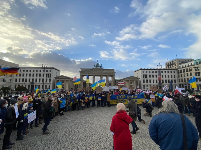 Дословно: "… 30 января в Берлине украинцы и друзья Украины вышли на совместную акцию, чтобы в который раз продемонстрировать миру, что украинцы выступают против войны, и призвать федеральное правительство использовать свое влияние на Российскую Федерацию, чтобы остановить новую российскую агрессию против нашего государства".