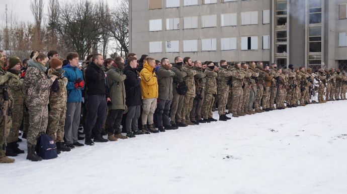Дословно Нацкорпус: "Участие в мероприятии приняло более 300 человек. Подавляющее большинство из участников – обычные украинцы, которые хотят быть готовы к защите родного города, собственной семьи в случае полномасштабного наступления России, которая продолжает стягивать армию к границам с Украиной".