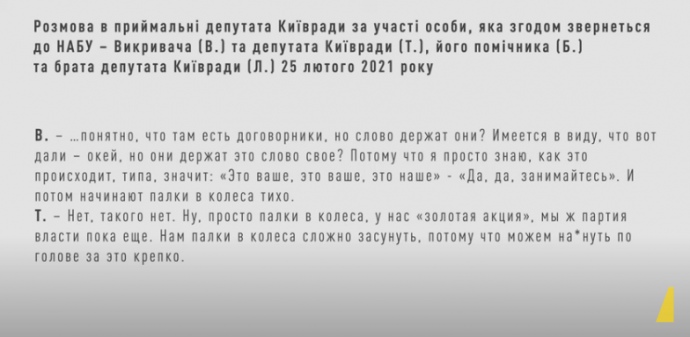 Национальное антикоррупционное бюро опубликовало оперативное видео переговоров участников в деле по подозрению депутата Киевского горсовета от "Слуги народа" Владислава Трубицына и еще пятерых лиц, разоблаченных на получении неправомерной выгоды.