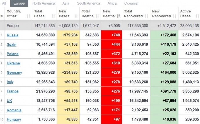 По суточной смертности от коронавируса в Европе лидируют Россия, Испания, Польша. Украина – 4-я в этом списке.
