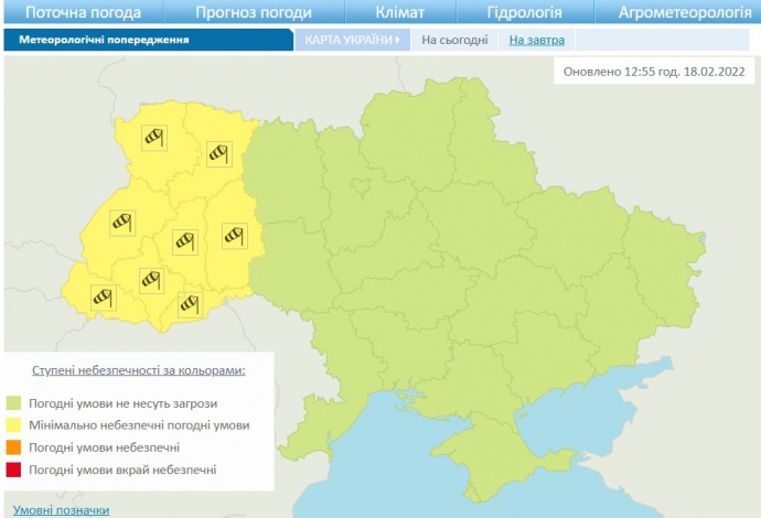 Дословно: "19 февраля ночью и утром в западных и большинстве северных областей, днем по большей части территории страны порывы ветра 15-20 м/с (І уровень опасности, желтый)".