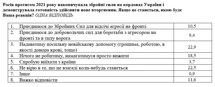 Детали: Социологи задали опрошенным вопрос: "Россия в течение 2021 года накапливала вооруженные силы на границах Украины и демонстрировала готовность совершить новое вторжение. Если это произойдет, какой будет Ваша реакция?"