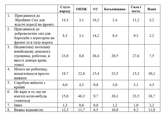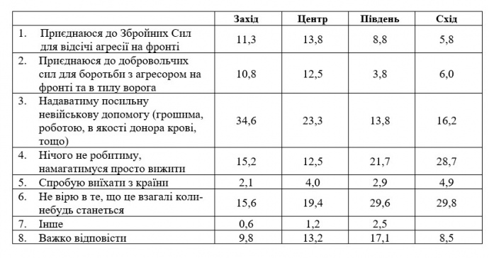 18,5% опрошенных ответили, что "просто постараются выжить". 3,7% попытаются уехать за пределы Украины.