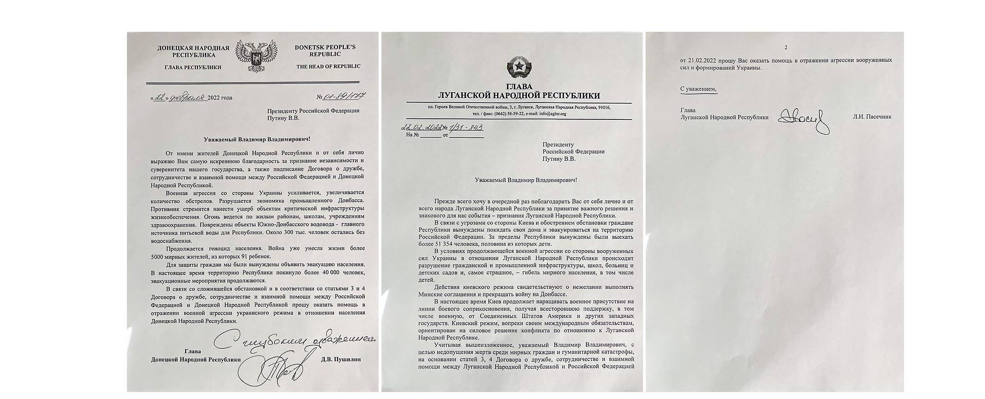 Прямая речь Пескова: "Главы двух "республик" в связи со сложившейся обстановкой (...) на основании договоров о дружбе, сотрудничестве и взаимной помощи между РФ и республиками просят президента России оказать помощь в отражении агрессии Вооруженных Сил Украины".