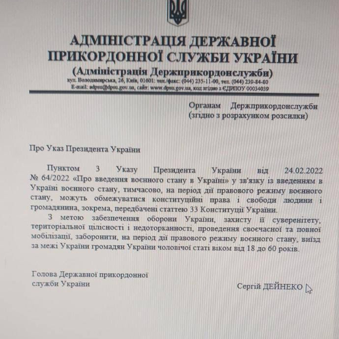 Государственная пограничная служба сообщает, что в связи с введением в Украине военного положения временно ограничен выезд из Украины отдельной категорией граждан.