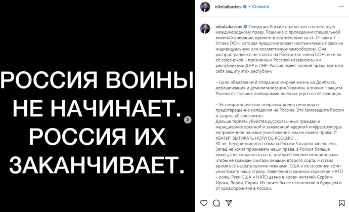 Басков написал в Instagram, что "операция России полностью соответствует международному праву" – и сослался на документы ООН и право на "коллективную самооборону".