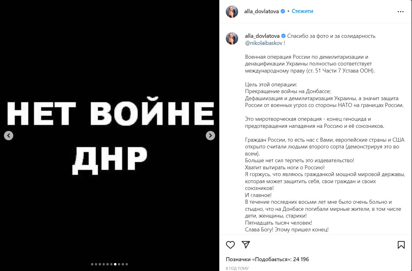 Детали: Войну, которую в России называют "операцией" поддержали певец Николай Басков, ведущие Алла Довлатова, Тина Канделаки, Маша Малиновская и Дана Борисова, блогеры Курбан Омаров, Татьяна Брухунова и Амиран Сардаро.
