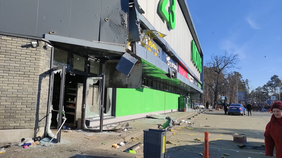 А так выглядит разбитый "Новус" в центре города, один из самых популярных бучанских супермаркетов: