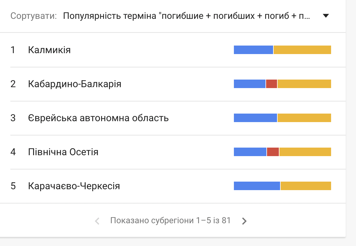 Больше всего ищут по запросу "погибшие" в Калмыкии, Кабардино-Балкарии, Еврейской Автономной Области, Северной Осетии, Карачаево-Черкесии, Алтае, Тиве, Ингушетии, Ставропольском крае, Псковской области, Амурской области Курской, Костромской области, Адыгее, Кемеровской области, Алтайском крае, Дагестане, Волгоградской области, Краснодарском крае, Ростовской области, Мордовии и Коме.
