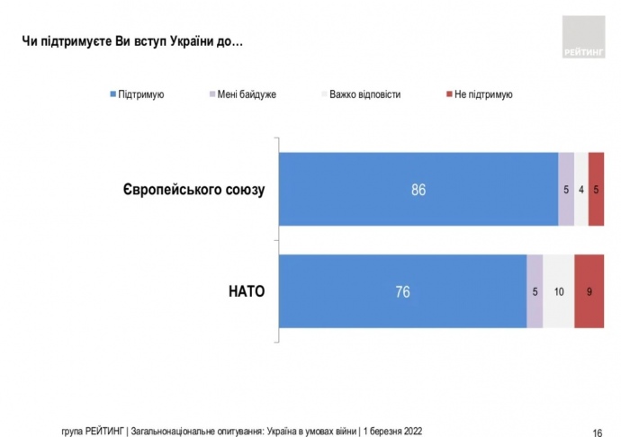 Поддержка вступления Украины в Европейский Союз и НАТО самая высокая за всю историю опросов: 86% поддерживают присоединение Украины к ЕС, 76% - за вступление в НАТО.