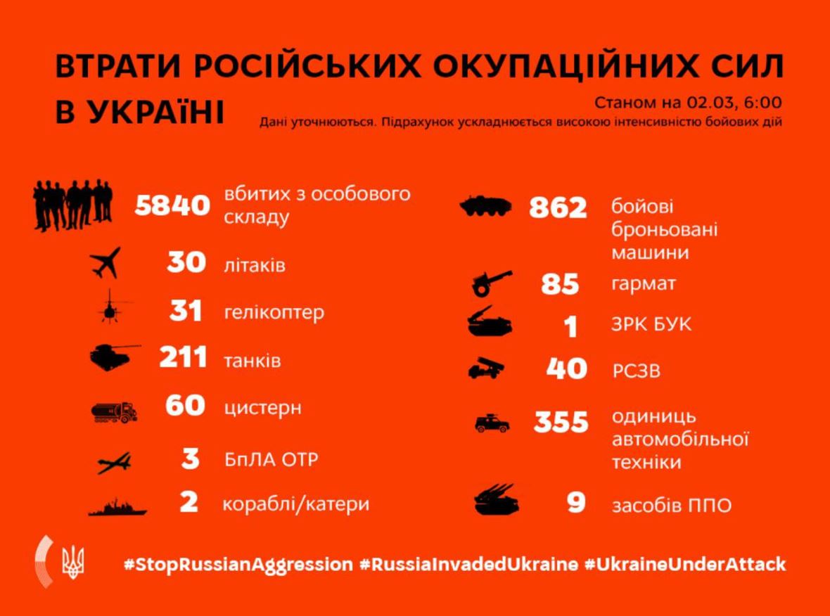 В то же время, украинские защитники сообщают, что за 6 дней войны россияне потеряли в Украине около 6 тысяч человек и тысячи единиц техники.