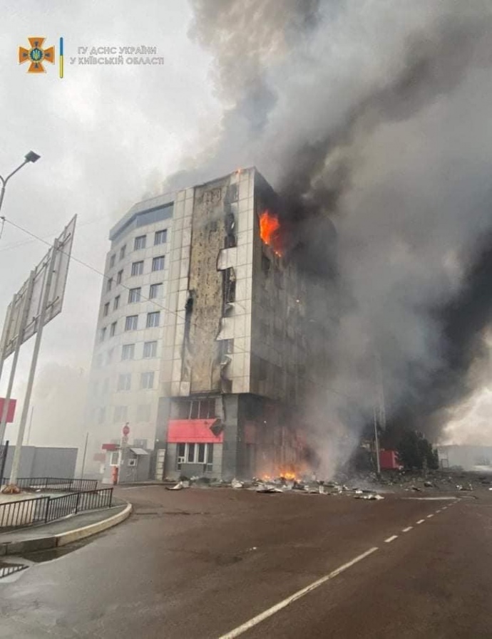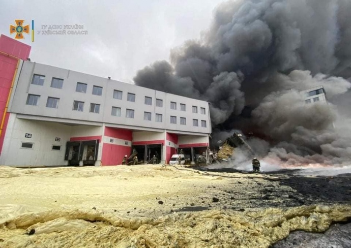 Дословно: "Киевская область, Бучанский район: в с. Чайки в результате попадания снаряда в складское помещение по изготовлению и хранению монтажной пены произошло возгорание склада на площади 10 000 м кв и 8-этажного административного здания".