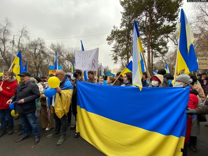 Митингующие выражают несогласие с тем, что Казахстан воздержался при принятии резолюции ООН, осуждающей нападение России на Украину. Она была принята, так как 141 член организации проголосовал за документ, в котором содержится требование к России прекратить военные действия, вывести войска с территории Украины в ее международно признанных границах, в том числе из аннексированного в 2014 году Крыма.