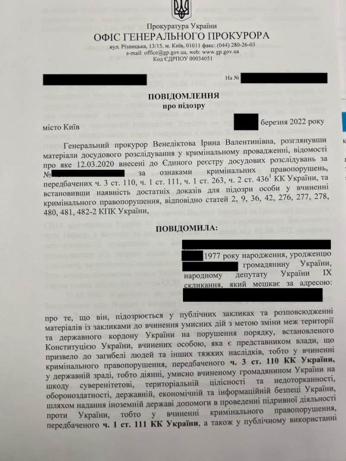 Детали: Киве объявили подозрение по ст. 110 (посягательство на территориальную целостность) и ст. 111 (государственная измена).