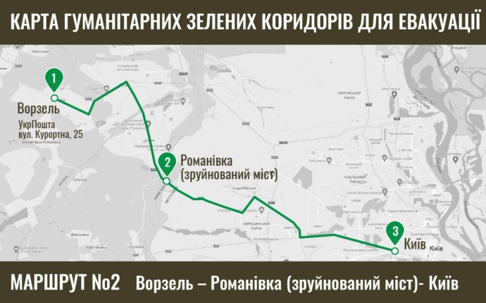 На официальной странице Бучанского горсовета в Facebook появилось сообщение, что 9 марта с 10:40 до 11:00 будет проводиться эвакуация из Бучи и Ворзеля на железнодорожный вокзал Киева.