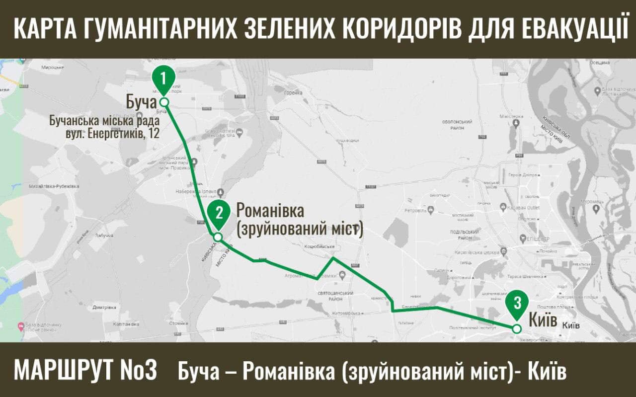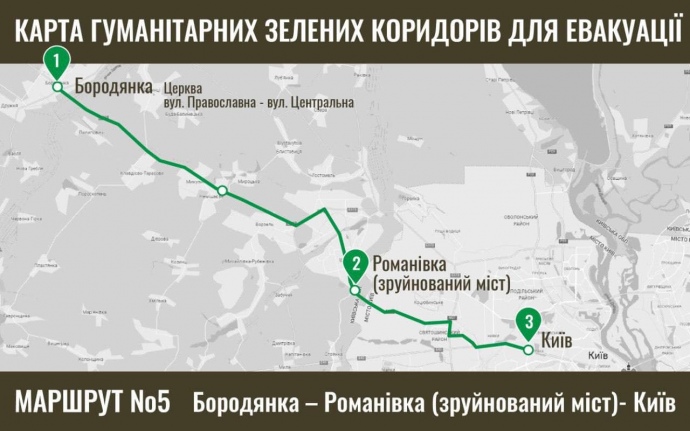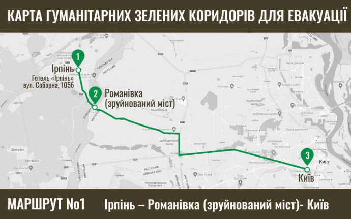 Дословно КОВА: "Сегодня будет проходить эвакуация населения Киевской области по гуманитарным коридорам: из городов Ворзель, Бородянка, Ирпень, Буча, Гостомель через Стоянка – Белгородка в город Киев.
