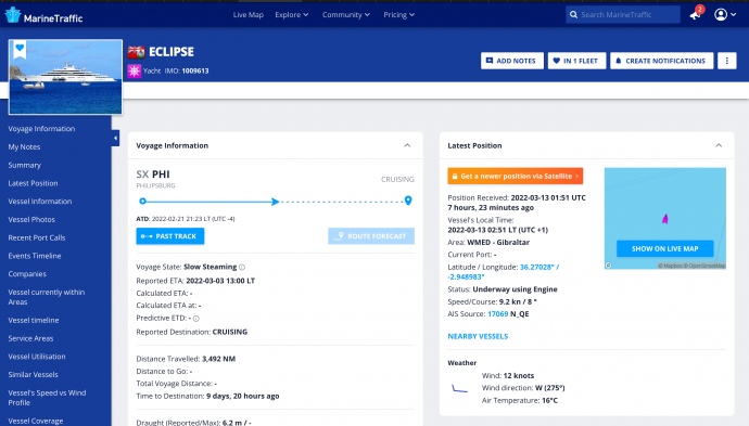 Российский олигарх Роман Абрамович спасает свои ихты от санкций: 139-метровую яхту "Solaris" перегнали из порта Барселоны в Тиват (Черногория), а яхту "Eclipse" вывели с Карибских островов.