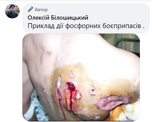 Справка. Такие боеприпасы содержат ядовитый белый фосфор. Это могут быть авиабомбы, артиллерийские снаряды, ракеты, мины, ручные гранаты. Женевская конвенция запрещает использование боеприпасов с фосфором. Пример воздействия такого оружия: