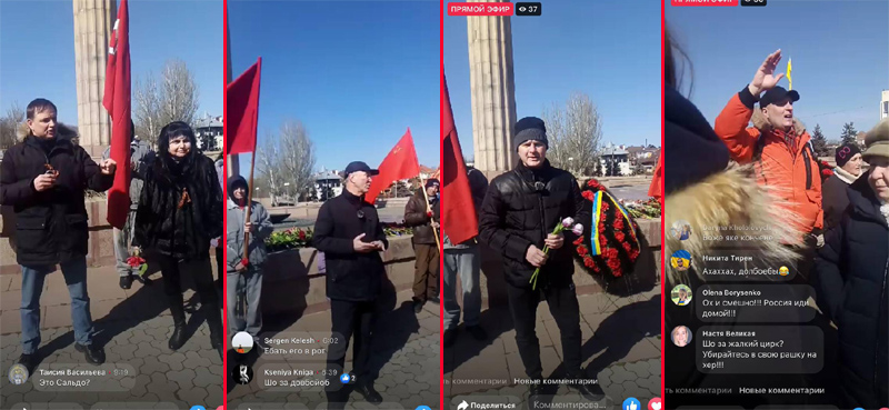 Также в Херсоне несколько людей митинговали в поддержку оккупантов. Они держали красные флаги СССР.